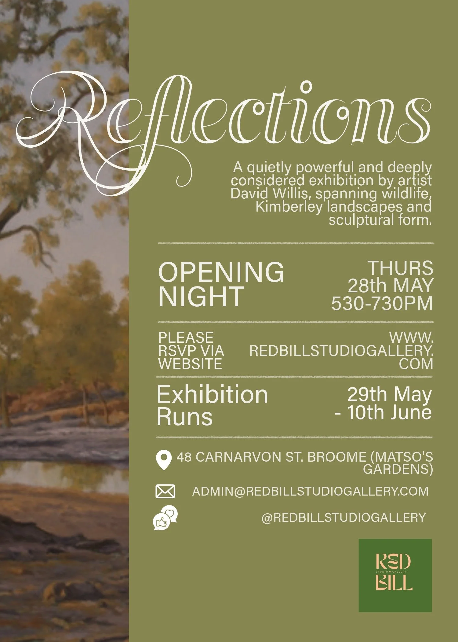 OPENING NIGHT Friday 29th May at 5:30pm Enquiries please email admin@redbillstudiogallery.com